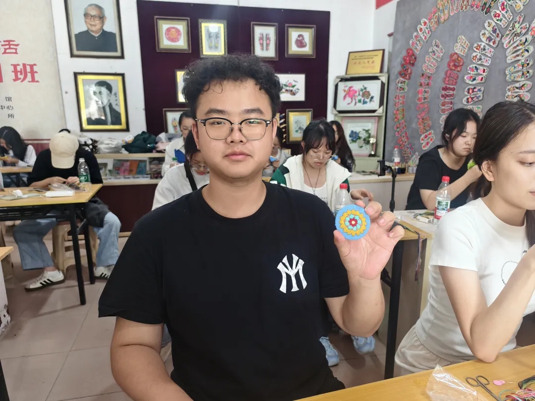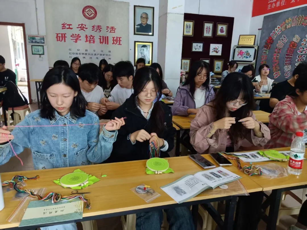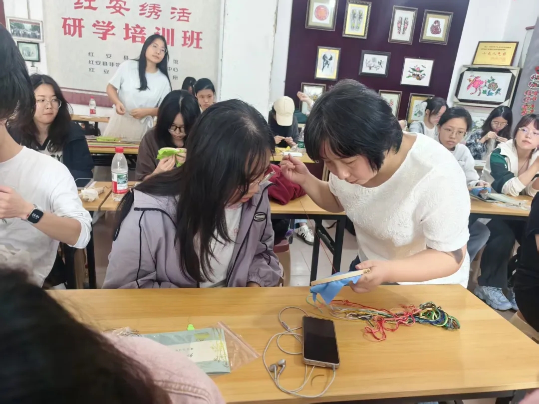 随后在红安绣活传习所的“学非遗”环节,学子们围坐桌前,在传承人指导下拿起针线。穿针、引线、落针,从简单的直线绣到基础的花纹勾勒,大家耐心尝试,指尖虽显生涩,却满是对这项技艺的专注。在一针一线的实践中,学子们读懂了红安绣活背后“慢工出细活”的坚守。