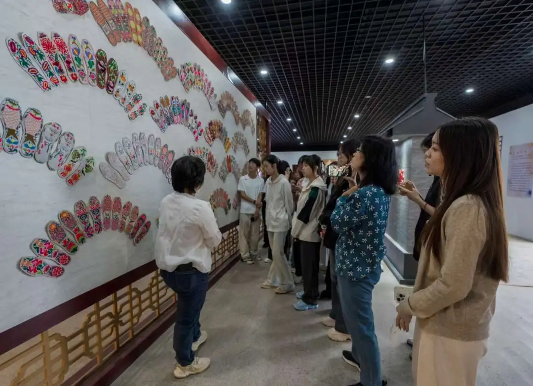 在红安绣活传承中心,学子们开启“看非遗”之旅。作为国家级非遗项目,红安绣活以丝绣、挑绣、绒绣为特色,鞋垫上的吉祥纹样、童帽上的精致图案,皆出自传承人手笔。一针一线间,不仅是精湛技艺的展现,更藏着红安民间的生活智慧与审美情趣,让学子们直观感受传统刺绣的灵动与厚重。